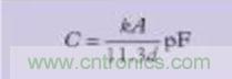 當尋找有問題的寄生源時,可能用得著幾個計算上述那些寄生電容尺寸的基本公式。(公式一)是計算平行極板電容器的公式,如(圖五)。