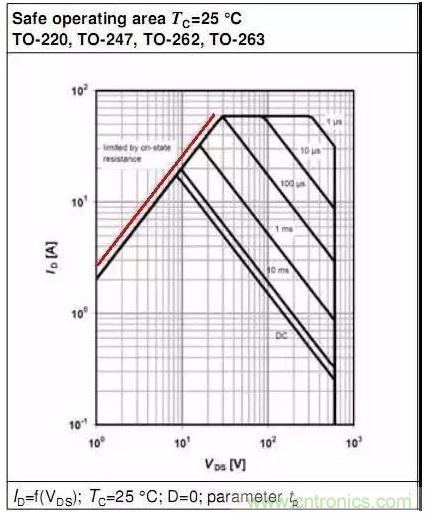 MOSFET datasheet上往往只有Tc=25和80℃時的SOA,但實際應用中不會剛好就是在Tc=25或者80℃,這時候就得想辦法把25℃或者80℃時的SOA轉換成實際Tc時的曲線。怎樣轉換呢?