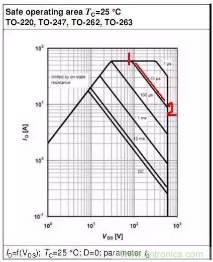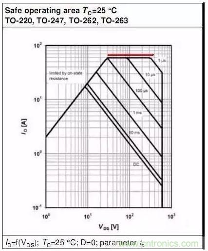 此圖中:當VDS=1V時,Y軸對應的ID為2A,Rds=VDS/ID=0.5R ==>Tj=150℃時,Rds(on)約為0.5R.當VDS=10V時,Y軸對應的ID為20A,Rds=VDS/ID=0.5R ==>Tj=150℃時,Rds(on)約為0.5R.所以,此部分曲線中,SOA表現為Tj_max時RDS(on)的限制.