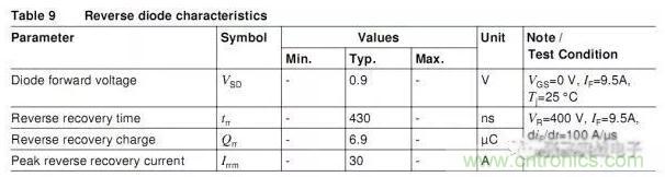 VSD,二極管正向壓降 ==>這個參數不是關注的重點,trr,二極管反向回復時間 ==>越小越好,Qrr,反向恢復電荷 ==>Qrr大小關系到MOSFET的開關損耗,越小越好,trr越小此值也會小