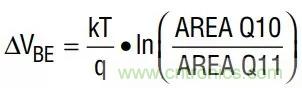 基本帶隙基準電壓源背后的數(shù)學原理很有意思,因為它將已知溫度系數(shù)與獨特的電阻率相結(jié)合,產(chǎn)生理論上溫度漂移為零的基準電壓。圖5顯示了兩個晶體管,經(jīng)調(diào)整后,Q10的發(fā)射極面積為Q11的10倍,而Q12和Q13的集電極電流保持相等。這就在兩個晶體管的基極之間產(chǎn)生一個已知電壓: