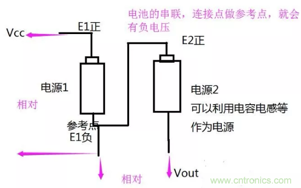 想產(chǎn)生負(fù)電壓,就讓他相對于電源負(fù)極的電勢更低即可。要想更低,必須有另一個(gè)電源的介入,根本原理都是利用兩個(gè)電源的串聯(lián)。電源2正極串聯(lián)在參考電源1的負(fù)極后。電源2負(fù)極就是負(fù)電壓了。