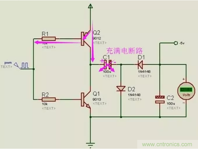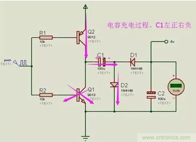 當(dāng)PWM為低電平時(shí),Q2關(guān)閉,Q1打開,C1開始放電,放電回路是C1-C2-D1,這實(shí)際上也是對C2進(jìn)行充電的過程。C2充好電后,下正上負(fù),如果VCC的電勢為5點(diǎn)幾伏,就可以輸出-5V的電壓了。