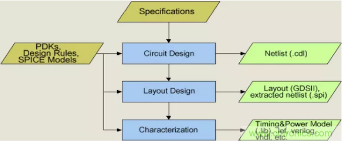 工程實踐中,從定義系統芯片參數(specifications)完成后,人們常常將最常見的數字集成電路中標準邏輯單元的版圖設計過程簡化為電路設計(circuit design)、版圖設計(layout design)和特征化(characterization)等三個步驟,見圖1簡化的版圖設計流程圖。在實踐中,版圖設計類型又分為: 1)標準版圖設計,2)半定制版圖設計,和3)全定制版圖設計。