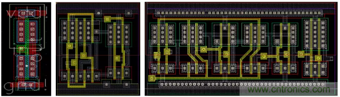 對于標準單元的版圖,根據工藝要求,標準邏輯單元的高度是固定的,寬度為最小單元寬度的公約數倍數,例如在圖3中,左圖為反向器(inverter,INV)的版圖,中圖為選擇器(multiplexer,MUX)的版圖,右圖為D型寄存器的(D-Flip Flop, DFF)的版圖。如上所述,從版圖設計中,可以導出并建立GDSII和LEF文件。GDSII文件經過設計簽核(design sign-off)過程由代工廠使用于芯片制造,LEF文件用于全芯片的P&R物理設計。