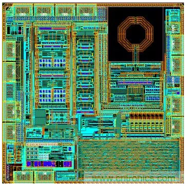 射頻無線模塊或者獨立的射頻芯片,從電路設計到版圖設計,完全屬于全定制設計方式。設計人員在標準版圖設計和半定制版圖設計的基礎上,不斷開發出專用的芯片射頻產品。圖6為某射頻公司自行設計的5GHz通信產品全定制版圖案例,即版圖為全手工設計,芯片制造采用180nm射頻工藝,其數據率達到5Gbps。