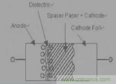 4. 陰極箔( Cathode Foil ):連接電解液和外部的層,這層在制作中并不需要氧化,但是在實(shí)際中由于在蝕刻過(guò)程中鋁容易被氧化,所以其形成了一個(gè)自然被氧化的氧化層,這個(gè)氧化層可以承受 1~2v 的電壓。