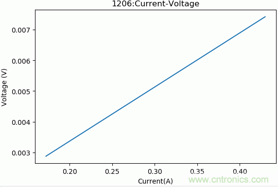 下面分別測試了0603, 0805, 1206三種封裝下,通過的電流和電阻兩端之間的電壓的關(guān)系。可以看到三種封裝的電阻都在電流實際超過6A之后,電壓開始快速上升。