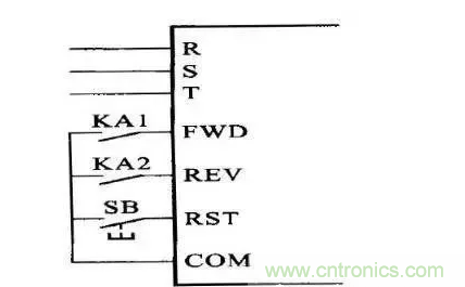 3、找到變頻器的控制端子,在外面加裝2個中間繼電器,分別是KA1與KA2,接線方法如下圖所示,KA1工作時,變頻器正轉,KA2工作時,變頻器反轉,SB是復位按鈕,當有異常報警時,變頻器會停機,此時按下RST,可以消除報警,然后再重新啟動變頻器。