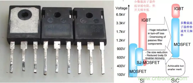 由SiC制作的MOSFET耐壓高,或者在同樣的耐壓要求下,MOSFET的尺寸就小,從而大大降低了MOS管的導通電阻和傳熱熱阻。