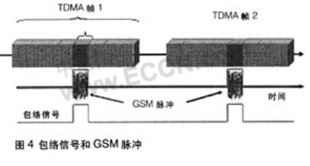 特定的手機(jī)只在屬于它的時間空當(dāng)發(fā)射。包絡(luò)信號的基本頻率是1/4.615 ms=217Hz。諧波頻率為434Hz、651Hz等。如此頻率是聽得到的。如圖4所示,為手機(jī)的包絡(luò)信號。