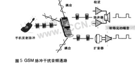 當(dāng)手機(jī)與基站通訊,或兩個手機(jī)彼此接近時,發(fā)射脈沖通過擴(kuò)音器,揚(yáng)聲器,或頭戴式耳機(jī)線傳人音頻通路。見圖5。