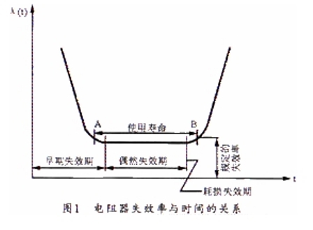 電阻器產品在正常條件下使用的失效可分為三種類型,即早期失效、偶然失效和耗損失效。圖1所示是電阻器失效率與時間的關系曲線。從曲線上可看出三種失效的三個階段。由于偶然失效出現(xiàn)在產品可靠工作的時期,研究這一時期的失效因素有重要意義。要提高產品的可靠性,必須加強產品對各種"應力"所能耐受的強度。這里所謂的"應力"是指對產品功能有影響的各種因素,如溫度、電壓電流、機械力等。