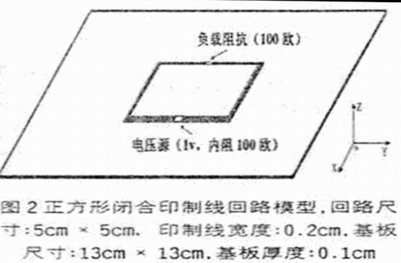 這是一種帶有接地平面的正方形的閉合印制線環路,在回路的兩端分別接有電壓源和阻抗相等的源內阻、負載,當電壓信號的頻率較高時,這種結構與方環形天線是非常相似的,成為一種嚴重的輻射源。