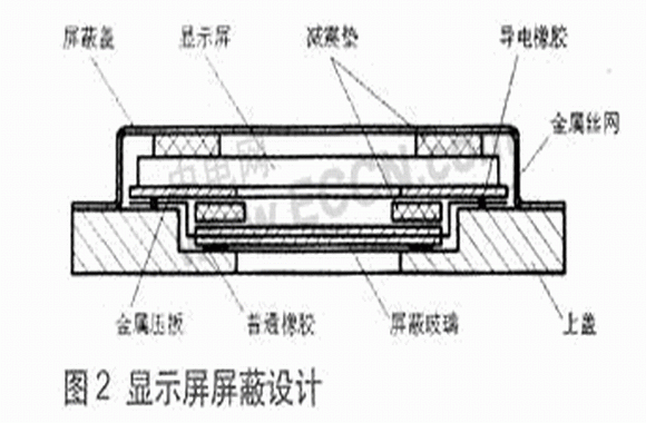 屏蔽玻璃安裝完畢,待粘膠涼干后再裝顯示屏。為了防止終端內(nèi)部電路的干擾,最后用屏蔽蓋把顯示屏包圍起來。顯示屏的屏蔽結(jié)構(gòu)如圖2所示。