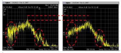 圖1.D類系統的近場EMI測量結果。從紅色的虛線可看出左邊的固定頻率時鐘方案和右邊的擴展頻譜調制之間的分別。