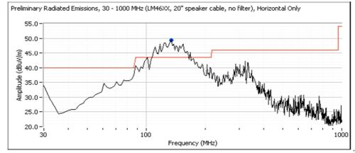 圖3.沒有邊沿速率控制的擴展頻譜D類放大器。器件在EMI測試中,在沒有使用任何濾波器的情況下驅動20英寸長的揚聲器電纜,其結果符合FCCB級的EMI限制。