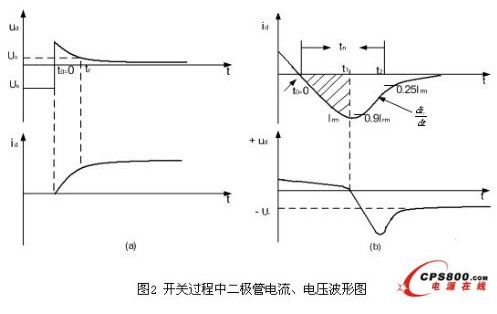 開關(guān)管工作在硬開關(guān)條件下開關(guān)電源自身產(chǎn)生電磁干擾的根本原因,就是在其工作過程中的開關(guān)管的高速開關(guān)及整流二極管的反向恢復(fù)產(chǎn)生高di/dt和高dv/dt,它們產(chǎn)生的浪涌電流和尖峰電壓形成了干擾源。開關(guān)管工作在硬開關(guān)時還會產(chǎn)生高di/dt和高dv/dt,從而產(chǎn)生大的電磁干擾。圖1繪出了接感性負(fù)載時,開關(guān)管工作在硬開關(guān)條件下的開關(guān)管的開關(guān)軌跡,圖中虛線為雙極性晶體管的安全工作區(qū),如果不改善開關(guān)管的開關(guān)條件,其開關(guān)軌跡很可能會超出安全工作區(qū),導(dǎo)致開關(guān)管的損壞。由于開關(guān)管的高速開關(guān),使得開關(guān)電源中的高頻變壓器或儲能電感等感性負(fù)載在開關(guān)管導(dǎo)通的瞬間,迫使變壓器的初級出現(xiàn)很大的浪涌電流,將造成尖峰電壓。開關(guān)管在截止期間,高頻變壓器繞組的漏感引起的電流突變,從而產(chǎn)生反電勢E=-Ldi/dt,其值與電流變化率(di/dt)成正比,與漏感量成正比,疊加在關(guān)斷電壓上形成關(guān)斷電壓尖峰,從而形成電磁干擾。此外,開關(guān)管上的反向并聯(lián)二極管的反向恢復(fù)特性不好,或者電壓尖峰吸收電路的參數(shù)選擇不當(dāng)也會造成電磁干擾。由整流二極管的反向恢復(fù)引起的干擾源有兩個,它們分別是輸入整流二極管和輸出整流二極管。它們都是由電流的換向引起的干擾。由圖2表明,t0=0時二極管導(dǎo)通,二極管的電流迅速增大,但是其管壓降不是立即下降,而會出現(xiàn)一個快速的上沖。其原因是在開通過程中,二極管PN結(jié)的長基區(qū)注入足夠的少數(shù)載流子,發(fā)生電導(dǎo)調(diào)制需要一定的時間tr。該電壓上沖會導(dǎo)致一個寬帶的電磁噪聲。而在關(guān)斷時,存在于PN結(jié)長基區(qū)的大量過剩少數(shù)載流子需要一定時間恢復(fù)到平衡狀態(tài)從而導(dǎo)致很大的反向恢復(fù)電流。當(dāng)t=t1時,PN結(jié)開始反向恢復(fù),在t1-t2時間內(nèi),其他過剩載流子依靠復(fù)合中心復(fù)合,回到平衡狀態(tài)。這時管壓降又出現(xiàn)一個負(fù)尖刺。通常t2《t1,所以該尖峰是一個非常窄的尖脈沖,產(chǎn)生的電磁噪聲比開通時還要強(qiáng)。因此,整流二極管的反向恢復(fù)干擾也是開關(guān)電源中的一個重要干擾源。