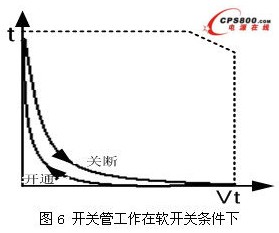 一般來說,可以采用軟開關(guān)技術(shù)來解決開關(guān)管的問題,如圖6所示。圖6給出了開關(guān)管工作在軟開關(guān)條件下的開關(guān)軌跡。軟開關(guān)技術(shù)主要減小開關(guān)管上的開關(guān)損耗,也可以抑制開關(guān)管上的電磁干擾。在所有的軟開關(guān)技術(shù)中,準(zhǔn)諧振抑制開關(guān)管上電磁干擾的效果比較好,所以本文以準(zhǔn)諧振技術(shù)為例,介紹軟開關(guān)技術(shù)抑制EMI。所謂準(zhǔn)諧振就是開關(guān)管在電壓谷底開通,見圖7。開關(guān)中寄生電感與電容作為諧振元件的一部分,可完全控制開關(guān)導(dǎo)通時電流浪涌與斷開時電壓浪涌的發(fā)生。采用這種方式不僅能把開關(guān)損耗減到很小,而且能降低噪聲。谷底開關(guān)要求關(guān)斷時間中儲存在中的能量必須在開關(guān)開通時釋放掉。它的平均損耗為,由此公式可以看出,減小會導(dǎo)致大大降低,從而減小開關(guān)上的應(yīng)力,提高效率,減小dv/dt,即減小EMI。