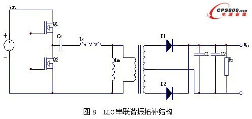 圖8為LLC串聯(lián)諧振的拓?fù)浣Y(jié)構(gòu)。從圖中可以看出,兩個主開關(guān)Ql和Q2構(gòu)成一個半橋結(jié)構(gòu),其驅(qū)動信號是固定50%占空比的互補(bǔ)信號,電感Ls、電容Cs和變壓器的勵磁電感Lm構(gòu)成一個LLC諧振網(wǎng)絡(luò)。在LLC串聯(lián)諧振變換器中,由于勵磁電感Lm串聯(lián)在諧振回路中,開關(guān)頻率可以低于LC的本征諧振頻率fs,而只需高于LLC的本征諧振頻率fm便可實現(xiàn)主開關(guān)的零電壓開通。所以,LLC串聯(lián)諧振可以降低主開關(guān)管上的EMI,把電磁輻射干擾(EMI)減至最少。在LLC諧振拓?fù)渲校灰C振電流還沒有下降到零,頻率對輸出電壓的調(diào)節(jié)趨勢就沒有變,即隨著頻率的下降輸出電壓將繼續(xù)上升,同時由于諧振電流的存在,半橋上下兩個主開關(guān)的零電壓開通條件就得以保證。因此,LLC諧振變換器的工作頻率有一個下限,即Cs與Ls和Lm的串聯(lián)諧振頻率fm。在工作頻率范圍fm<f<fs內(nèi),原邊的主開關(guān)均工作在零電壓開通的條件下,并且不依賴于負(fù)載電流的大小。同時,副邊的整流二極管工作在斷續(xù)或臨界斷續(xù)狀態(tài)下,整流二極管可以零電流條件下關(guān)斷,其反向恢復(fù)的問題得以解決,不再有電壓尖峰產(chǎn)生。