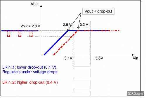 從圖2可以看到,電池電壓的500mV瞬變將如何依據線性穩壓器的有效壓降轉移到LDO輸出端。第1行的線性穩壓器(藍色實線)具有小于100mV的壓降,因此它保持在穩壓狀態。相反,第2行的線性穩壓器(紅色虛線)不能維持這樣的壓降,因為它要求輸入和輸出電壓之間至少有400mV的壓差。