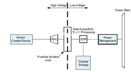 隔離電路的主要原因是保護電路不受危險電壓和電流的損壞。在圖1的醫(yī)療應用實例中,即使是小量的AC電流也有可能造成致命的傷害,因此需要采用一個隔離層來保護病人。隔離還可對敏感電路進行保護,使其免于受到工業(yè)應用中出現(xiàn)的高壓損壞。圖2的工業(yè)實例僅為一個高壓測量法。將傳感器與實際高壓相隔離使得對低壓電路的測量成為可能。