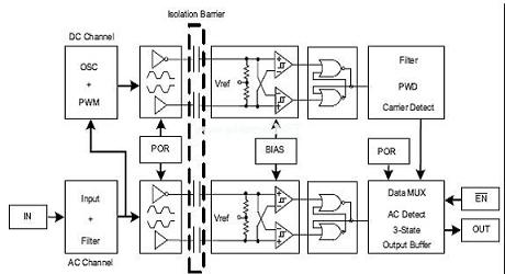 為了提供恒定信息的傳輸,ISO72x使用一個高信號速率和低信號速率通道來進行通信,如圖9所示。高信號速率通道未被編碼,并且其在一個單端到差分轉換之后的隔離層上傳輸數據。該低信號速率通道以一種脈寬調制格式對數據進行編碼,并在隔離層上差分傳輸數據,從而確保了恒定狀態(tài)的精確通信(1和0的長字符)。