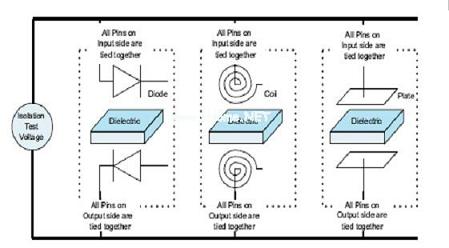三個主要標準驗證了對于隔離保護的必要性,其分別為UL1577、IEC60747-5-2和CSA。雖然每一種標準都稍有不同,但是均提供了一個對比隔離性能的標準。IEC、UL和CSA的測試證實了輸入和輸出之間電介質擊穿以外的電壓。運用這些標準非常簡單,因為測試標準和隔離方法無關。圖10顯示了隔離測試是如何將隔離器看作是兩端器件的。盡管每種器件的物理結構存在差異,但隔離測試卻是在電介質擊穿電壓上測定的。