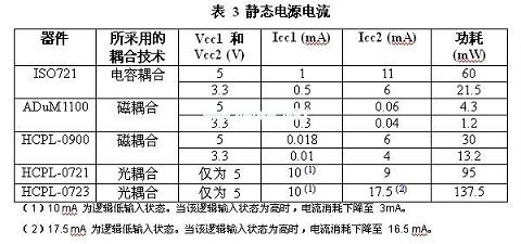 除了隔離層上信號傳輸的效率之外,輸入和輸出調節(jié)電路的設計同功耗的相關性最大。如表3所示,與電感或電容實例相比,光耦合器的功耗會更高。