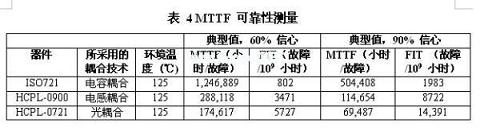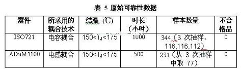 ADuM1100可靠性數據表沒有明確地說明MTTF,但是其提供了可靠性測試的結果。表5顯示了ISO721和ADuM1100可靠性測試的參數。