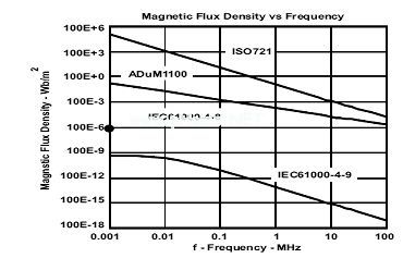 圖12對比了ADuM1100和ISO72x(沒有找到HCPL-0900的數據)的磁場抗擾度。相對來說盡管這兩個實例均對磁場有一定的抗擾度,但是ISO72x提供了更大的裕度。如前面所述,光耦合隔離層電路對外部磁場具有內在的磁化抗擾度。