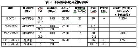 噪聲降低和噪聲保護使得隔離器在那些隔離器中斷接地環(huán)路并將接地電壓差隔離的電子電路中得到廣泛使用。設計人員現(xiàn)在擁有許多用來進行數字信號隔離的選擇,包括TI推出的ISO72x系列,其在信號速率、電介質擊穿電壓、瞬態(tài)抗擾度、功耗、磁場抗擾度以及可靠性等重要特性方面均表現(xiàn)不俗。表6對本報告中所討論實例的這些特性進行了總結。