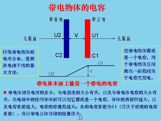 我們給大家介紹一個很重要的概念,就是電容。這個電容和我們現(xiàn)在電路里面用的電容是兩個概念,大家不要混淆。任何帶電體我們都可以把它看成一個電容,電容的大小跟它帶的電壓和電荷的多少有關,如果帶的電荷越多,電壓越高它的電流就越大。電容的概念其實與電荷的概念也是互相對應的,我們把這個電容器看成是兩個電容進行串聯(lián),也就是說帶電體帶正電,帶正電是對于無限遠的地方來說的,為什么呢?因為這個帶電以后電場分布是發(fā)散性的,中間這一點是最強,離的越遠的時候電感強度就越來越低,當無限遠的時候就等于零,你不能拿它來參考地球,參考地球的話相當于范圍太小,本身地球也可以看成電容,所以分析電容的時候最好用無限遠的地方作為參考點。也就是說我們計算電容的時候以無限遠的地方考慮,計算電容也是以無限遠的地方考慮。把這兩個電容靠在一起的時候就變成了電容器,你就可以利用這兩個電容的電位梯度和電容器來分析。任何一個帶電體都可以看成一個電容,一個孤立球導體的電容等于表面積除以半徑,再乘以電容系數。地球的容量算出來就是7×10-4(F),把兩個孤立電容進行推導,算出來就是這樣,電容器正好等于上面儲存的電容量除以電位差。明白電容的概念以后,也要分析電路的電磁感應方面,要有量的概念。有了量的概念我們可以對電磁干擾進行分析,比如說這邊是一個干擾電壓,通過這條電路進行供電,旁邊也有一個電路,這個電路就會受到干擾,干擾怎么計算?它的導向電路是什么?我們可以把兩個導線看成一個電容器,就是有一個耦合電容。等效電路相當于這邊,你要減少兩個回路互相干擾的程度就必須要減少上面的Cm電容,把兩條線隔得越遠越好,而且越短越好,只要面積越小電容器越小,離得越遠電容器也越小。