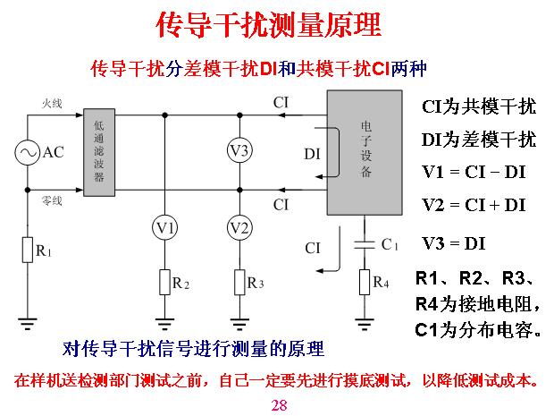 傳導干擾測量原理。這里面?zhèn)鲗Ц蓴_有兩個干擾,一個是共模,一個是差模,這樣一個回路是流進入又流出來的,這叫做差模。這兩個同時進去從另外一邊流出來叫共模,共模干擾很簡單,就是以大地為一端,另外一端是以上面的線路、設備,不管什么線為一端測到的電壓,這叫做共模干擾。因為測量的時候必須要與一根電路連接,先測三個電壓,這是測這個與大地之間的電壓,這是測兩條線之間的電壓,然后得出結算公式。V1=CI-DI,就是共模干擾減去差模干擾。V2=CI+DI,V3=DI,R1、R2、R3、R4為接地電阻,C1為分布電容,如果到檢測所去測之前自己一定要先進行摸底測試,用一塊墊板或金屬板放在下面接地,等于說分布是固定的,利用標準一塊板與機器造成分布電容,一般是一個平方米等等,是由他們定的,你可以做試驗,測多大都沒有關系,但它是固定的,測電視機是什么樣,測手機是什么樣,這是不一樣的。傳導干擾測量方法。分布電容在這一塊金屬板,與它之間產生分布電容,當然用這個板帶分布電容,測出來的結果數字越大,這只是用來做對比,以此為基礎。我們做摸底可以用大一點測,容易測得到,但你測得不算數。