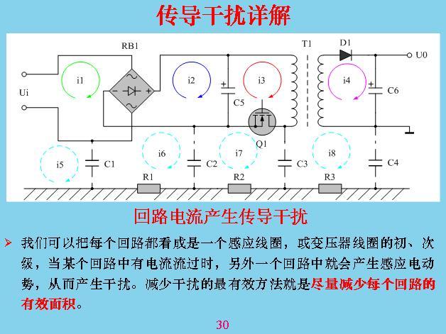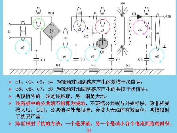 這個更加具體,有電力穿過的時候會產生電力線,電力線會產生共模干擾,這幾個都是共模干擾,那些都是差模干擾。這些干擾主要是如何產生的?本身線路里面只有電流流過,構成一個線圈或導線都會產生干擾,最大的是變壓器漏感,這是其他回路的好幾十倍。所以變壓器漏感最好進行屏蔽?怎么屏蔽呢?在線圈的外邊用一層金屬,鋁片也好,銅片也好,一般用銅片包起來,包起來應該讓它短路,就是用焊絲焊起來,漏感在上面也會產生渦流,一產生渦流就會產生抵消干擾的磁場,就相當于把漏感抵消掉。