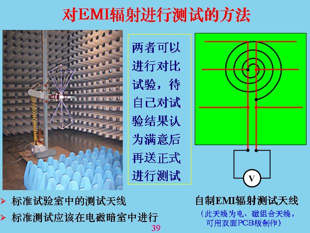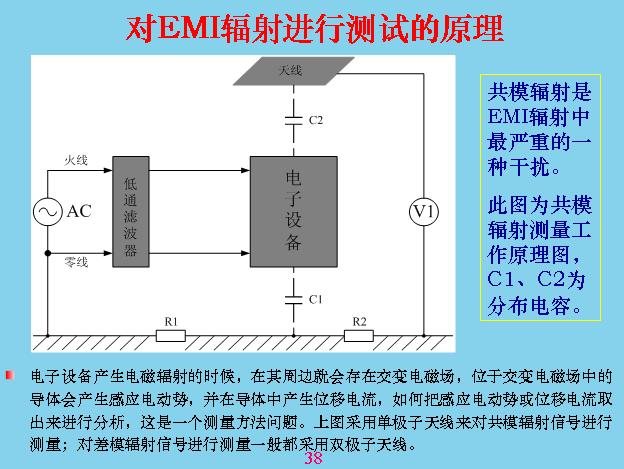 另外對于輻射干擾,我們最注意的就是共模干擾,差模干擾相對來說比共模干擾小很多,我們做過一個試驗,在同一個導線里面流過的電容,相差的共模干擾是2500倍。上面就是對輻射進行測試,剛才是共模干擾,其他都是傳導測試,其實就是輻射干擾測試,一般就是用天線來測,天線的測試原理就是這樣的,量天線和大地之間的電壓,這個設備與大地之間有分布電容,前面已經說過了,放這個在上面,與板接地產生分布電容。天線也有分布電容,分布電容不是跟設備大小和距離有關,所以測試的時候都有一個標準,固定設備中間距離有多遠,天線面積用多大,還有一套天線,很多天線,不只是一個,計最大的那個,就是測試電壓最大的那個,天線對輻射會產生諧振。