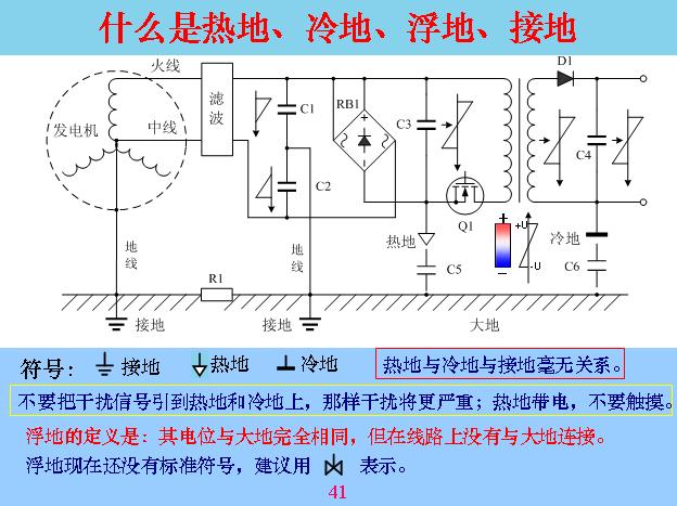 我們后面再講很具體的電路問題。很多人對地的概念不是很清楚,也不了解,現(xiàn)在很多人都把電路里面的公共關說成地,具體是不是?我們先介紹幾個概念。一般按照道理,最早地就是大地,后來地慢慢習慣用到設備里面,包括外殼、輸入線,比如說示波器或者信號線,與大地連在一起,有的不連,現(xiàn)在就變成了一個很模糊的概念,我們就把熱地、冷地、浮地、接地幾個概念簡單介紹一下。這個符號是比較標準的接地符號,就是接大地的,不管哪個設備接地都是這個符號。熱地國家還沒有標準,大部分都習慣用這個箭頭作為熱地。冷地國家也沒有標準,大家都接受是這樣的,這三個地基本上電工里面都有明確定義的,這個地就是接大地,熱地就是里面整流出來電源的某一端是公共端,人去摸它會帶電,會電死人,和前面的火線會產生回路電流,會電到人,所以這個叫做熱地。還有一個通過電子耦合以后沒有電的關聯(lián),只有磁場關聯(lián),你去量根本沒有回路,叫做冷地,手是可以摸的。但是你不要以為它是冷地就不帶電,實際上它還是帶電,為什么帶電?大家可能一下子不是很清楚,它帶的是靜電,相當于極化帶電,就是線圈通過感應以后,一頭帶負的,一頭帶正的。電容機也是,有一頭帶電,有一頭不帶電,這一點還是帶負電,不帶電的沒有跟電路連接,定位與大地一樣,所以叫做浮地。對應的不是與大地相等,但沒有與大地連接,拿電表來量這一點與大地沒有電壓。浮地的信號現(xiàn)在還沒有,如果大家參考的話可以參加這個符號來用,這個地方電位等于零,當兩邊發(fā)生變化就用這個來表,對電路分析有好處,特別是嚴重干擾的時候一定要把浮地找到,因為電位越高的地方電容越容易干擾,電位等于零,也就是浮地和電位是越低的地方干擾就越小。