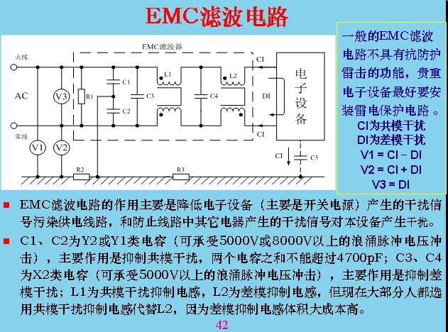 為了降低傳導干擾,現(xiàn)在一般在輸入電路里面都要加濾波器,這邊是設備產生的干擾,通過這幾個濾波以后就會把幾個電壓降低,這兩個電容是共模的濾波電容,這幾個有共模電感,也有差模電感,因為共模電感的體積比較大,成本比較高,所以大家都沒有用,都在用共模電感代替。因為共模電感本身有漏感,漏感對差模來說也有抑制作用,所以相對來說用共模電感代替差模電感,成本可以大大降低。這兩個電容很關鍵,在安全里面兩個的和不能超過470b,為什么?安全測試的時候在安全設備上加2500v交流電來測與地的漏電,如果超過2.5毫安就算不合格。這樣算的話50就是2500v電壓,算出來的電壓不能超過470b。按照共模預計,這兩個做得更大一點,最大不能超過4700v。這是差模電容,差模電容沒有要求,用的越大越好。但是用得越大也有一個問題,把電容線拔掉的時候上面帶電不能超過,所以這里必須加一個放電電阻,這邊大的以后也可以加一個放電電阻,充電拔掉以后,下面人不能摸,會電到人,所以用放電電阻把它放掉。