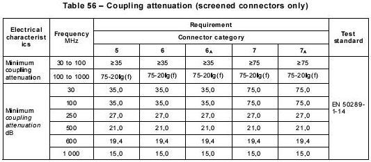 按IEC61196-1測試同軸電纜的方法,測試帶屏蔽的平衡電纜,短路8根芯線后用50Ω信號源激勵。被測試線長1米,測試頻率30MHz,頻率越高,線長越短導體表面轉移阻抗。主要用于評估連接硬件的屏蔽效率,其實測值不超過以下計算值。