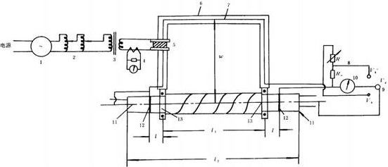 按下圖裝置,測試電纜金屬護套及鎧裝層的理想屏蔽系數γ0s=VC/VS(線芯上的感應電壓mV;電纜式樣金屬套上的縱向干擾電壓mV)。