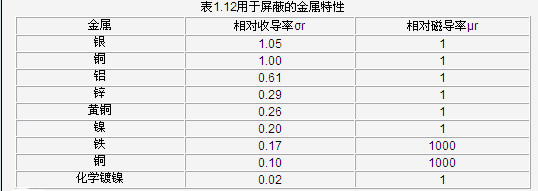 表1.12給出了一些常用屏蔽材料的相對導電率和導磁率。