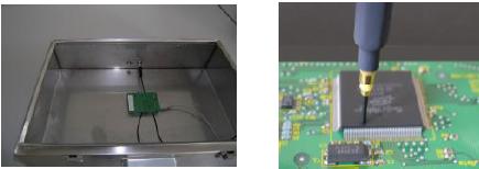 表面掃描法通過(guò)測(cè)量集成電路表面電場(chǎng)和磁場(chǎng)的方法來(lái)描述集成電路的電磁發(fā)射特性。該方法的測(cè)量頻率范圍可達(dá)10MHz—3GHz,測(cè)量采用電場(chǎng)探頭或磁場(chǎng)探頭按一定順序掃過(guò)集成電路表面,由接收機(jī)將相應(yīng)的測(cè)量結(jié)果依次傳送給計(jì)算機(jī)處理。測(cè)試結(jié)果的準(zhǔn)確性與電場(chǎng)或磁場(chǎng)探頭的特性和探頭定位裝置的精度有關(guān)。該方法可用于探測(cè)集成電路芯片上不同部位的電磁發(fā)射分布情況,適用于對(duì)集成電路的不同設(shè)計(jì)方案的電磁發(fā)射特性的比較。