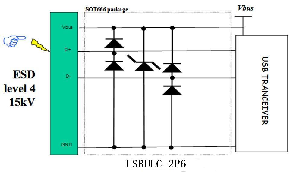 除保護兩條數據線路外,還必須保護Vbus線路。這是這個特殊的保護器件的另一個增值之處,因為它保護D+、D-和Vbus三條線路。專用的TVS二極管在相同的條件下像保護數據線路一樣保護Vbus線路,防護ESD浪涌。