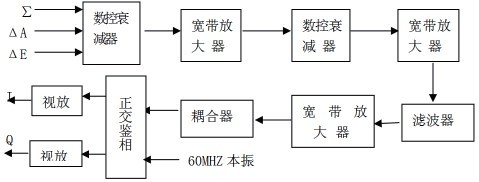 視頻接收組合是由I/Q正交鑒相器和視頻放大器組成。其中應用數控衰減器實時調整各路本振信號的相位,以達到補償接收機系統相位一致性的目的。最后輸出反射和應答的12路I/Q信號以及反射和應答的檢波信號。