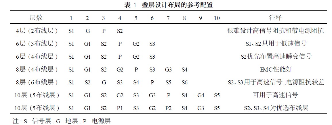 如果第2層分配為“地”,且第4層分配為處理器的電源,則過孔距離放置處理器和去耦電容器的頂層應該盡可能短。延伸到板的底層的過空剩余部分不包含任何重要的電流,而且距離短不會具有天線作用。表1列出了疊層設計布局的參考配置。