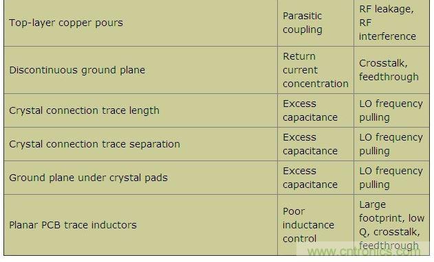本文羅列了各種不同的設(shè)計(jì)疏忽,探討了每種失誤導(dǎo)致電路故障的原因,并給出了如何避免這些設(shè)計(jì)缺陷的建議。本文以FR-4電介質(zhì)、厚度0.0625in的雙層PCB為例,電路板底層接地。工作頻率介于315MHz到915MHz之間的不同頻段,Tx和Rx功率介于-120dBm至+13dBm之間。表1列出了一些可能出現(xiàn)的PCB布局問(wèn)題、原因及其影響。