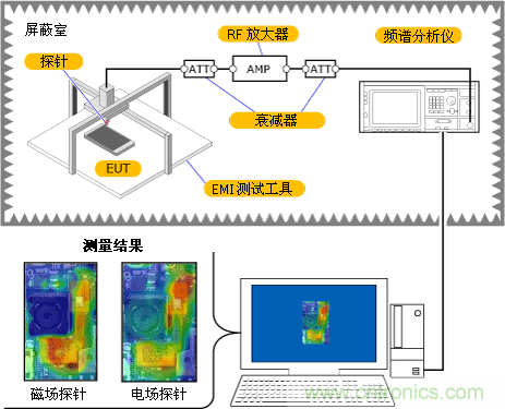 我們將EMI測(cè)試工具的電場探針和磁場探針通過RF放大器連接到頻譜分析儀,并對(duì)相鄰電磁場的分布進(jìn)行了分析。