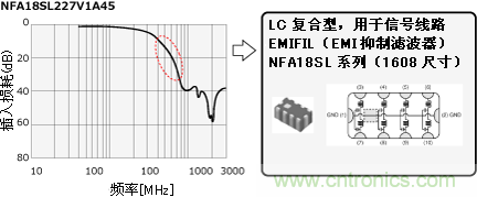 信號(hào)頻率為12MHz,同去除噪音所必須的頻帶700MHz相比頻率較低,為了接近信號(hào)頻率通過所必須的頻帶 (~100MHz) ,選擇了插入損耗曲線變化急劇,對(duì)信號(hào)頻率和噪音頻率選擇度較高的LC復(fù)合型EMI濾波器。因?yàn)樾盘?hào)線路很多,所以EMI濾波器為排容型NFA18SL系 列。在檢查靜噪效果和信號(hào)質(zhì)量之間平衡的同時(shí),我們選擇了220MHz的截止頻率。