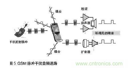 當手機與基站通訊,或兩個手機彼此接近時,發(fā)射脈沖通過擴音器,揚聲器,或頭戴式耳機線傳入音頻通路。見圖5,結(jié)果是音頻質(zhì)量大幅降低。