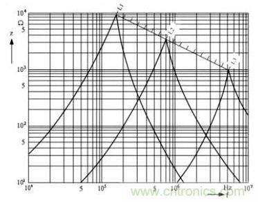 由圖中可以看出,電感線圈的阻抗開始的時候是隨著頻率升高而增大的,但當它的阻抗增大到最大值以后,阻抗反而隨著 頻率升高而迅速下降,這是因為并聯分布電容的作用。當阻抗增到最大值的地方,就是電感線圈的分布電容與等效電感產生并聯諧振的地方。圖中,L1 > L2 > L3,由此可知電感線圈的電感量越大,其諧振頻率就越低。從圖2中可以看出,如果要對頻率為1MHZ的干擾信號進行抑制,選用L1倒不如選用L3,因為 L3的電感量要比L1小十幾倍,因此L3的成本也要比L1低很多。